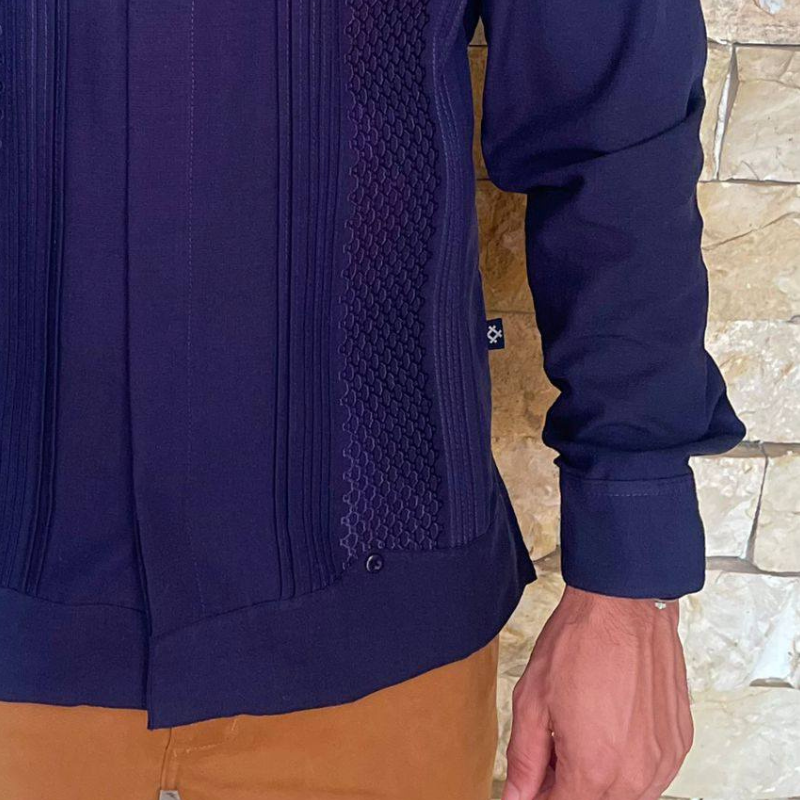 El color azul navy simboliza elegancia, autoridad y sobriedad. Perfecta para eventos formales, cenas elegantes o reuniones profesionales, esta guayabera se adapta a entornos donde la distinción y el buen gusto son esenciales. Su corte tradicional y confección artesanal garantizan un ajuste impecable y un estilo clásico.