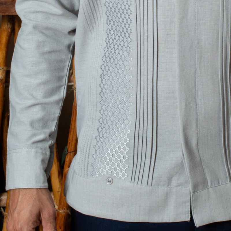 La guayabera manga larga gris de Estilo Guayabera es ideal para quienes valoran la estética atemporal, el confort y la elegancia artesanal. Una pieza que puedes llevar de día o de noche, con total confianza y estilo.