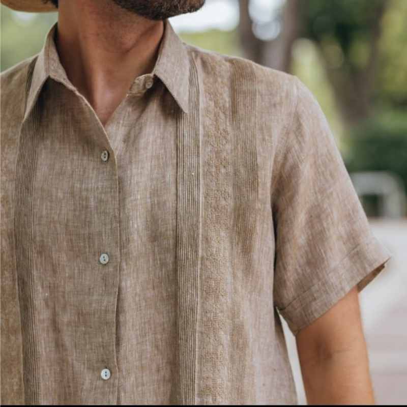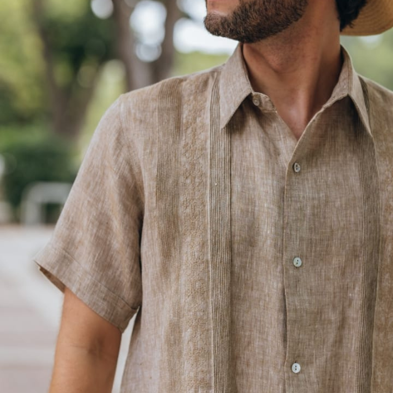 La camisa guayabera beige clasica es ideal para quienes buscan versatilidad, frescura y una elegancia atemporal. Una prenda esencial del guardarropa tropical.